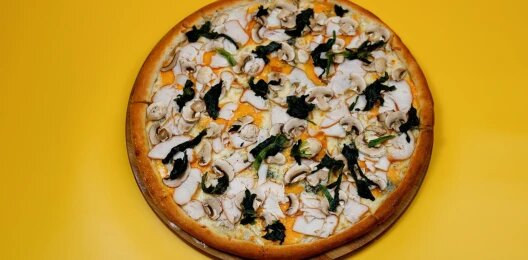 Моцарелла, традиционное тесто, сливочно-грибной соус, приготовленный именно для данной пиццы, в который входит сливочное масло и много грибов шампиньонов