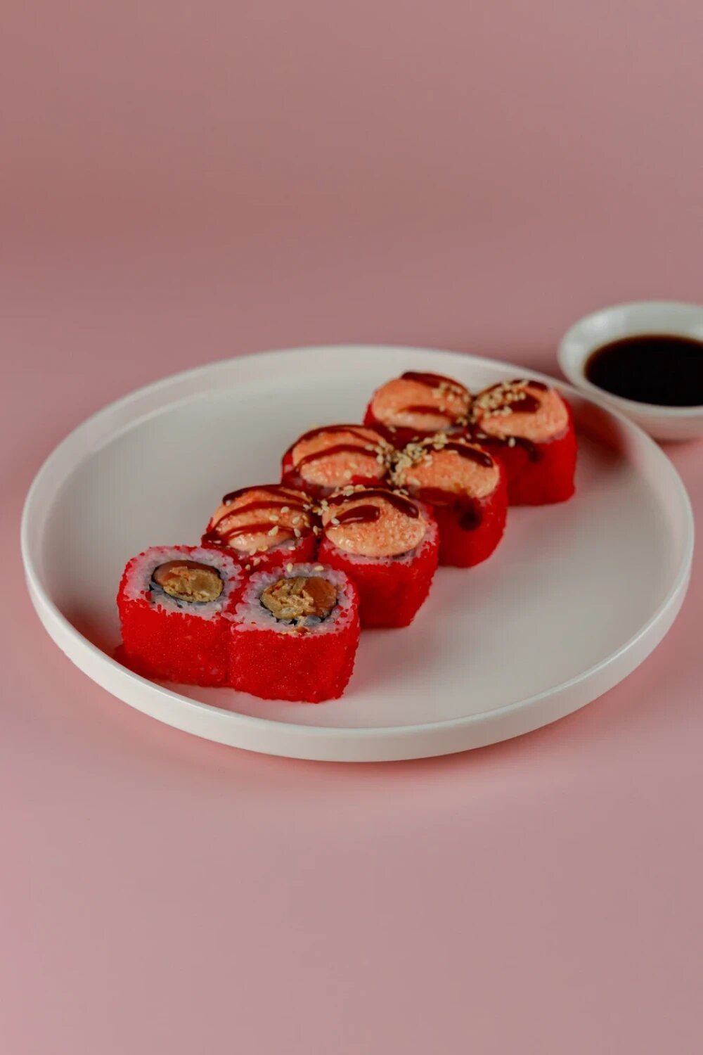 Лосось, Японский Омлет, Икра Масаго, Соус Яки, Соус Унаги, Кунжут, Нори, Рис.
